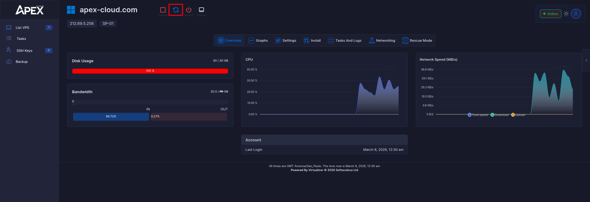 Click on the spinning arrows (highlighted) to reboot the VPS.